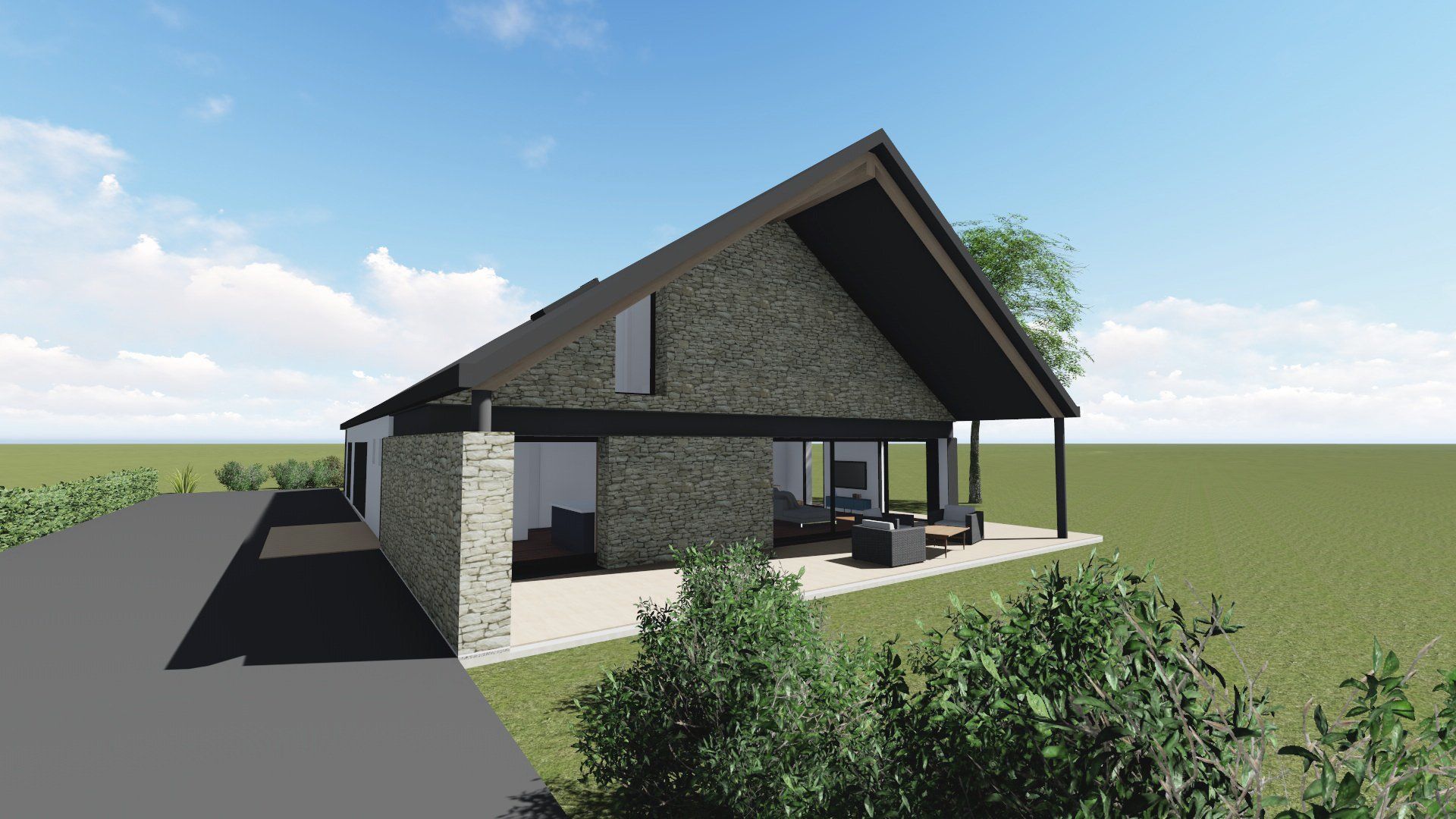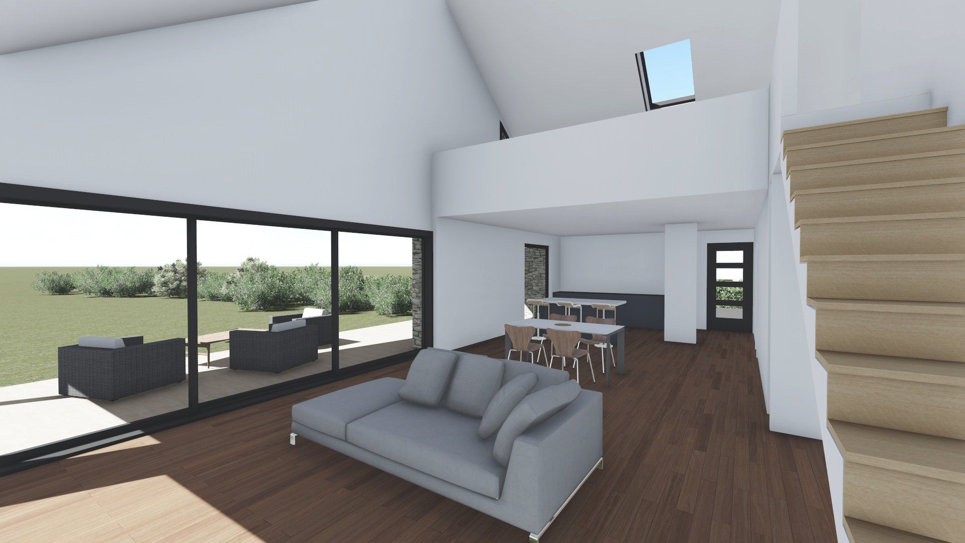 Le projet s'étire en long pour donner les espaces de séjour au sud, les chambres au nord-est et les garages au nord-ouest.