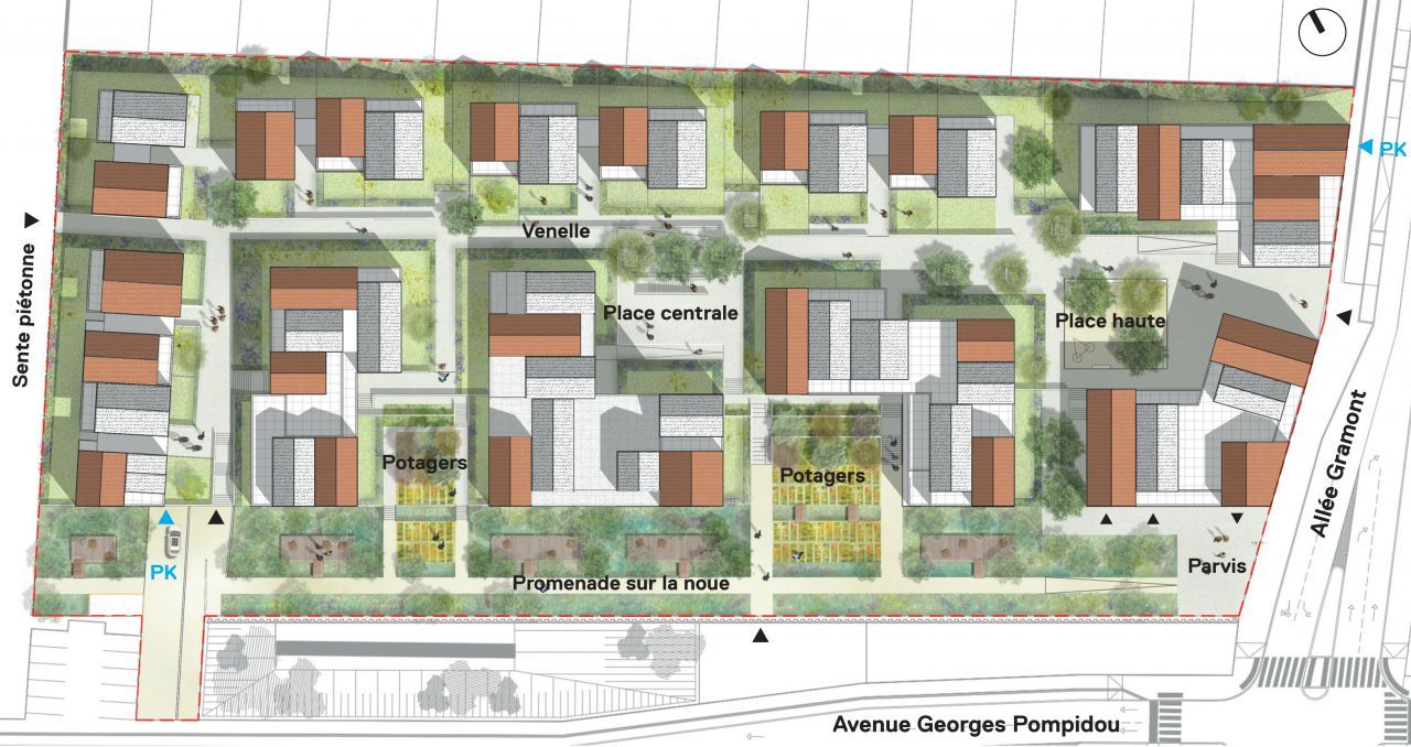 Le projet se compose de hauts immeubles en abord de la route, de logements plus petits en fond de parcelle. Entre ces différentes typologies nous trouvons des rues et des places qui veulent reconstruire l'ambiance d'un village.
